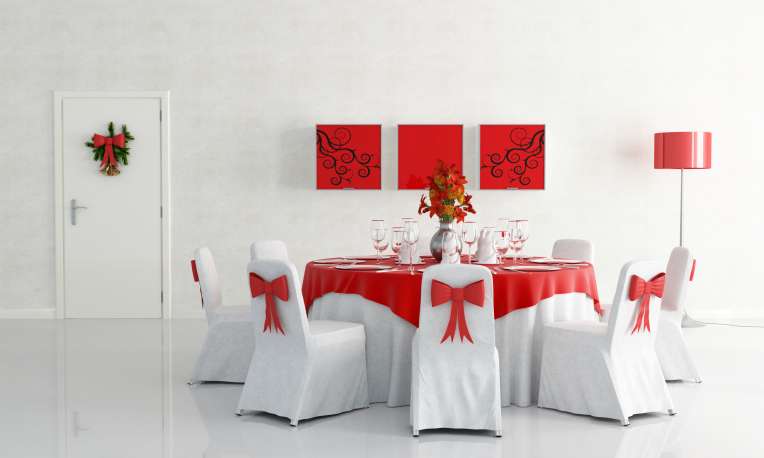 - Compétez la décoration avec des chaises et des coussins : Une idée facile qui donne une touche très « Noël » consiste à garnir les chaises avec un nœud d’une couleur combinée avec les tons que vous avez choisis pour votre table. Prenez un ruban de 10 cm de large et 2 mètres environ par chaise, faites un nœud à mi-hauteur du dossier, et pendez-y des ornements de Noël ou des noix avec des paillettes (les plus petits de la maison peuvent les décorer). Vous pouvez donner cette même touche aux coussins de votre canapé : il suffit de les entourer d’un joli ruban noué.